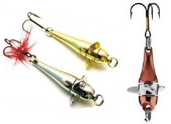 Для ловли в зимнее время и на больших глубинах используют отвесные блесны. На них отлично берет судак. Такие приманки имеют длинных лепесток, к концу которого крепится тройник. При опускании в воду блесна принимает вертикальное положение. Крючок либо припаивается к приманке, либо крепится через колечко. Это тяжелые блесны, которые зачастую еще дополнительно огружаются свинцом.