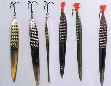 На концах этой приманки расположены тройник и заводное колечко. На тройник вешают бахрому или красные нитки, такие же украшения, как и в предыдущих приманках. Пилькеры подходят для отвесного блеснения и для ужения в заброс. Чаще всего используется классическая джиговая проводка. На пилькеры хорошо ловится судак и жерех.