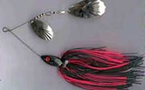 Интересную форму имеет приманка спиннербейт. Она состоит из уголка из проволоки и одной или нескольких блесен-лепестков. К проволоке крепится большой одинарный крючок с яркой бахромой. Может быть и силиконовая рыбка с пушистым хвостом из ярких полосок. Конструкция выглядит таким образом.