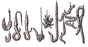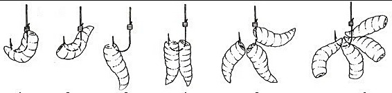 Насаживают червей чулком, кольцами, частями, пучками, по несколько штук, закрывают жало и оставляют открытым. На рисунке изображены варианты насаживания червей на крючок: