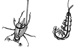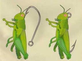 Насаживать жуков можно двумя способами. Если ловим в толще воды, в проводку, то жало прокалывается по центру и выводится из брюха. Если ловим нахлыстом, с поверхности, то жало выводится под головой. Главное, чтобы жало выходило снизу, не с боку и не сверху. На рисунке мы видим, как правильно насаживать жука и личинку.
