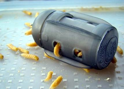 При ловле фидером иногда целесообразно использовать специальные кормушки для опарыша. Они представляют собой закрытые контейнеры с дырочками. В них добавляют опарыша, которых выползает их этих отверстий.