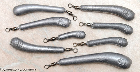 Грузы для оснастки дропшот представлены разными конфигурациями. Изделия выпускают в форме цилиндра, окружности, пули, капли и т. д. Грузила оснащают зажимным механизмом для сохранения во время ловли глубины погружения крючка. В процессе можно корректировать уровень, т.к. грузы могут перемещаться на леске. Вес изделий для водоемов с небольшим течением варьируется от 5 до 10 г. Для мест с быстрым движением потоков воды необходима масса в 15−30 г.