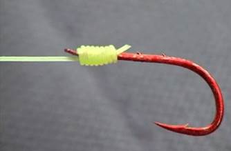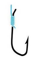 Если говорить простым языком, то крючки с лопаткой лучше подходят для тонких лесок, а с колечком – для толстых. Если правильно привязать крючок с колечком, то леска будет выходить прямо над изгибом. Вот таким образом: