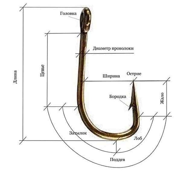 Крючок состоит из цевья, изгиба, жала, бородки, ушка или лопатки. На рисунке все эти элементы обозначены.
