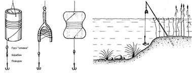 Щучьи поставухи могут быть самых разных видов, насколько позволяет фантазия очень изобретательных рыболовов. И такая многовариантность связана в первую очередь с небольшой глубиной и небольшим расстоянием установки снасти от берега. Начнём с очень оригинальных поставух, которые кроме своей простоты ещё наделены элементами маскировки.
