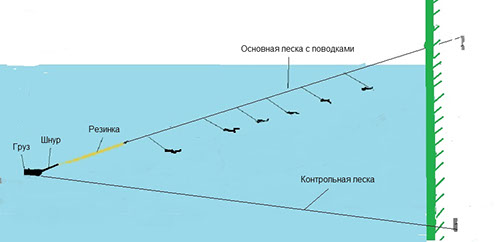 Но при отсутствии плавательного средства некоторые рыболовы ухитряются забрасывать груз прямо на резине, даже не используя страховочную леску. При этом длина заброса составляет до 40 метров. Грузило, конечно, используется не такое тяжёлое, как в ловле на сильном течении и завозе его на лодке. Где-то порядка 120 граммов. Имея форму ложки, такое грузило после рыбалки просто поднимается со дна натяжением резины и доставляется к берегу. Резина, понятно, должна быть новая и прочная. Конечно, это рискованный способ заброса грузила и вероятность обрыва резинового амортизатора увеличивается с размером пойманной рыбы, не говоря о том, что на дне могут быть какие-то препятствия. Если забрасывать груз рукой, то лучше ставить страховочную леску. Это делается так. Вначале резину растягивают на берегу до критического натяжения, которое можно назвать рабочим для конкретной ловли, то есть, на такое расстояние, которое будет в воде от груза до подлеска с крючками. Затем к резине прикрепляется петлями шнура или мягкой проволокой страховочная леска с креплениями на расстоянии примерно 2 м между витками. Она находится в натянутом состоянии, составляя ту же длину, что и растянутая резина. После того, как резина будет ослаблена, то прикреплённая леска будет держаться на резиновом амортизаторе в виде петель. При забросе она натянется вместе с растянутой до предела резиной. Конструкция несколько громоздкая, но она позволяет доставать груз после рыбалки или при обрыве резины, не используя лодку.
