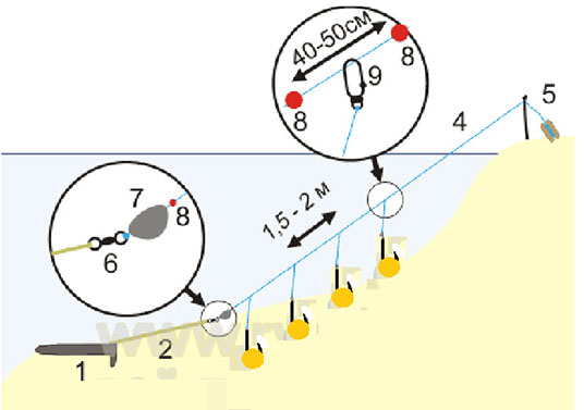 Другим важным фактором является свободное крепление поводков к подлеску, а это достигается у кого-то нанизанным на леску вертлюжком, движение которого ограничивается резиновыми узелками, кто-то ставит бусины. Можно использовать надетые на леску прозрачные маленькие пуговицы, к отверстиям которых привязывается поводок. Словом кто во что горазд. Главное чтобы поводки не перекручивались и не перехлёстывались на течении.