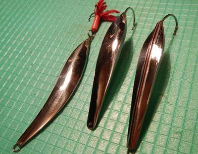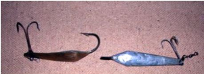 На одном из концов приманки впаян крючок, на втором может быть тройник, который крепится через заводное колечко. Если дно коряжистое, то используют блесну с одним крючком или тройником.