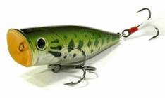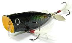 Чаще всего ужение на поверхностные приманки ведется попперами. Данная приманка имеет характерное углубление в носовой части (пятачке). За счет этой выемки поппер издает хлюпающие звуки. Громкость звучания зависит от величины пятачка и углубления приманки, а также от техники проводки.