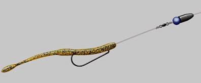 Пунктирная проводка рассчитана на ловлю судака, окуня, щуки и жереха. Не следует ждать очень активных атак хищник. При всяком касании рыбы к червю следует делать подсечку.