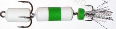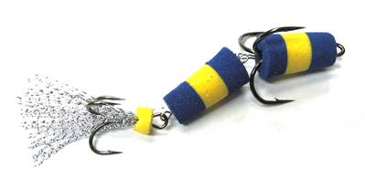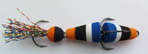 Ко второму концу приманки крепится грузик- чебурашка или другого типа. Мы видим, что один тройник спрятан в середину пенополиуретановых элементов и выглядывает только жало. А второй крючок замаскирован кисточкой. В воде мандула демонстрирует очень активную игру. На нее очень хорошо берет активный хищник: окунь, щука и окунь.