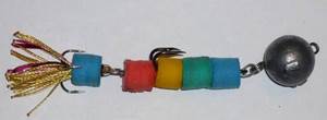 Мандула – это искусственная приманка, которая сделана из пенополиуретановых элементов, которые похожи на бочонки, шарики, усеченные конусы и т.п. Эти фигурки складываются из пенополиуретановых шайбочек. Элементы соединяются между собой проволочными ушками. К каждому элементу крепится тройник. На конце приманки часто фиксируется яркая кисточка из ниток или силикона. Вот так выглядит мандула: