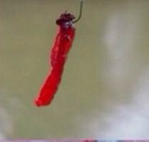 Еще один способ – это насаживание мотыля чулком. Прокалывается жалом первый или второй сегмент и проводится к ко второму концу, как это делается с червем. Жало может выходить из тела, а может оставаться внутри, как показано на рисунке.