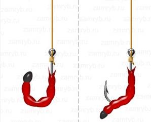 Как видно на рисунке, мотыль насаживается на мормышку. Можно сказать, это основная насадка в мормышечной ловле, особенно зимой.