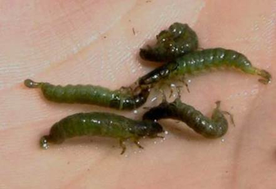 На мелководных участках водоемов на дне обитает ручейник- личинка бабочки зеленого цвета. Эти личинки живут в трубочках- домиках. Трубочки собираем вместе с личинками и отправляем в ту же емкость с другими личинками.