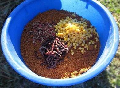 При замешивании и подготовке прикормки обязательно следует учитывать виды рыб, которые мы собираемся ловить. Если мы нацелены на карпов, значит необходимо готовить калорийную смесь с большим содержанием крупной фракции: пеллетса, консервированной кукурузы, гороха, бойлов и т.д. на такую рыбалку следует брать 6-8 кг. прикормки, если не больше. Придется потратить достаточное количество времени, чтобы накрыть хороший стол для такой крупной рыбы.