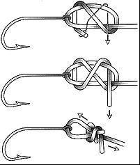 100% гарантия, что крючок не потеряется. Простой в исполнении и наиболее знакомый многим любителям рыбной ловли. Им можно эффективно работать по крючку с лопаточкой используя леску и нитку. Его можно по праву зачислить в ряды универсальных узлов. Многие рыболовы часто им пользуются.