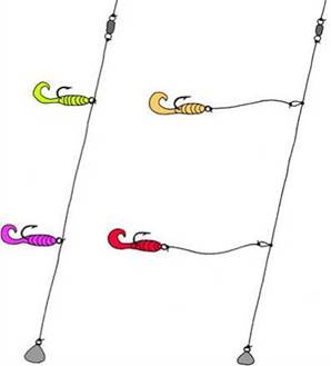 Чаще всего в слаги вставляются один офсетник или одинарный крючок. Если прицепить к одной леске 2-3 поводка с такой приманкой, то получится годная снасть для ловли окуня или щуки в придонном слое. Обычно слаги ведут по дну неспеша, с частыми паузами. Если ловим на течении, то можно просто забросить снасть как донку и ждать поклевок. В воде слаги будут шевелиться и привлекать хищника.