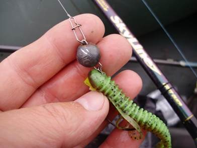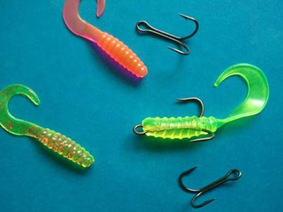 В первом случае приманка одета на крючок, впаянный в грузик круглой формы, а во втором – крючок крепится к ушку грузила. Первый способ крепления применяется чуть чаще. Крючок, как мы видим, выходит посередине твистера. Торчит только жало. Обычно используют одинарный крючок. Но если ловим на большой твистер трофейного хищника, то применяют двойник.