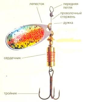 Лепесток – это элемент, который вращается вокруг стержня приманки. На него клеят пленку с узорами или окрашивают в разные цвета. С годами совершенствовалась форма лепестка. Для каждого хищника применяется определенная форма лепестка.