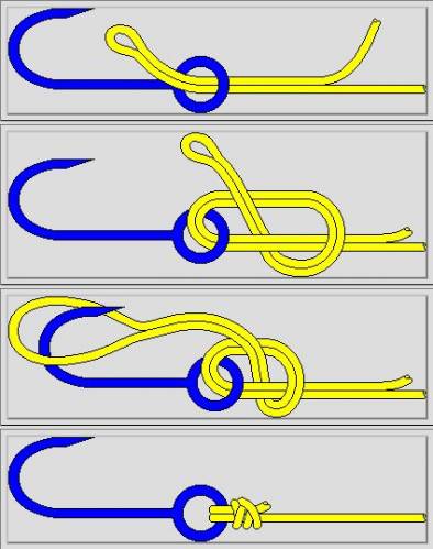 Охотно применяемый рыболовами узел для работы с монофильными лесками. Особенность. Рекомендуемый диаметр лесок для крючка с колечком при монтаже 0,4 мм. Лески «держат» до 98% своей грузоподъемности.